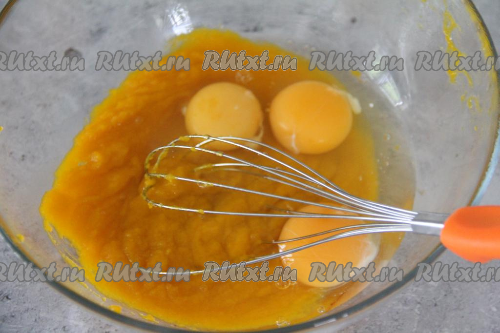 К пюре из тыквы добавить яйца, перемешать венчиком.