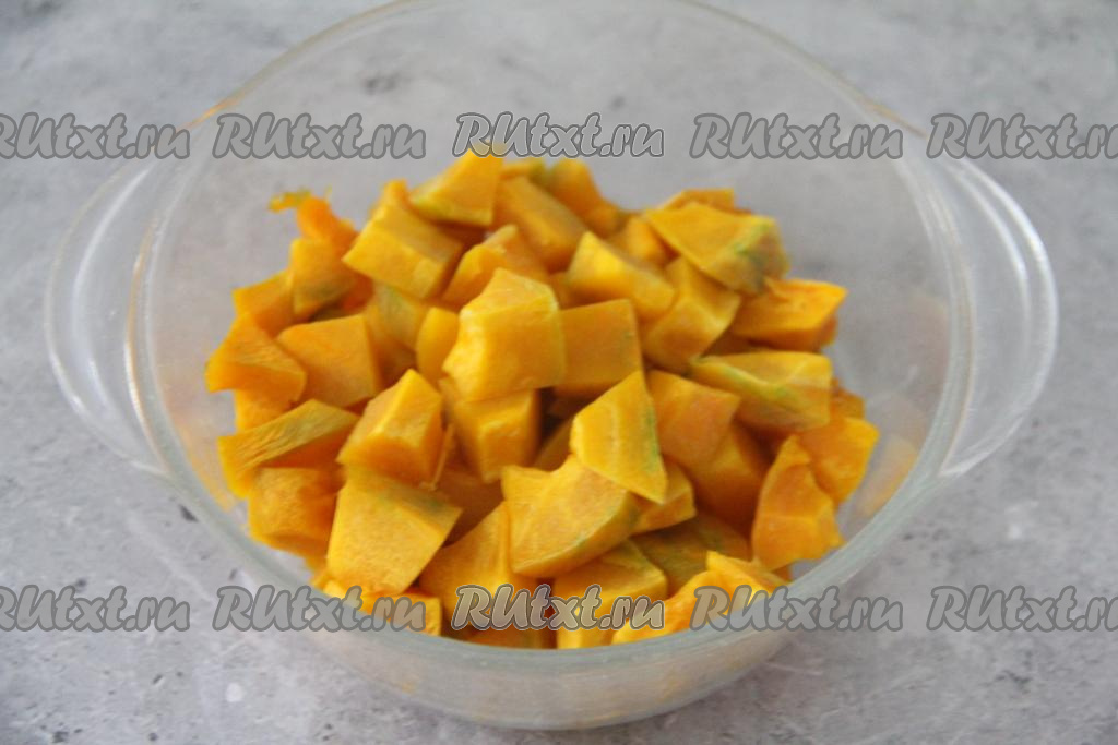 Подготовить продукты. 300 грамм тыквы, очищенной от волокон с семенами и кожуры, нарезать на кубики размером 2 на 2 сантиметра.