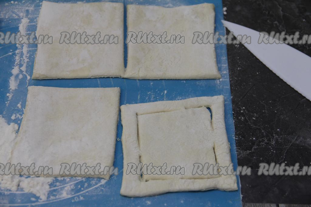 Слоёное тесто у меня было в виде двух пластов. Слегка раскатать каждый размороженный пласт теста на посыпанной мукой поверхности. Разрезать каждый пласт на 4 квадратика (из двух пластов теста у меня получилось 8 квадратов). Взять один квадрат теста. В каждом углу квадрата сделать г-образные разрезы, как на фото.