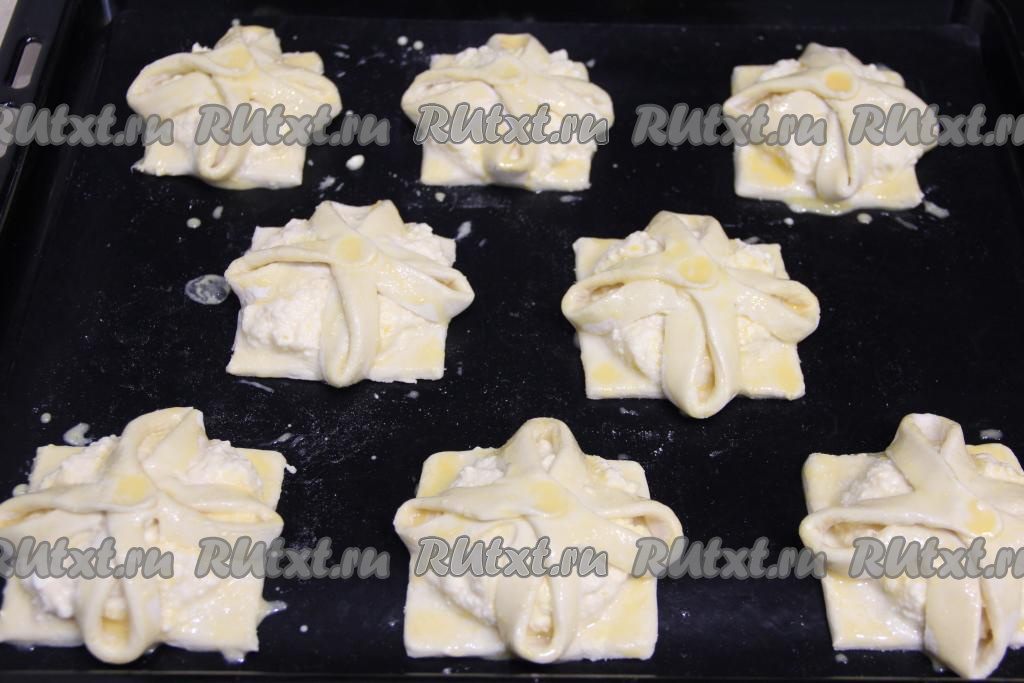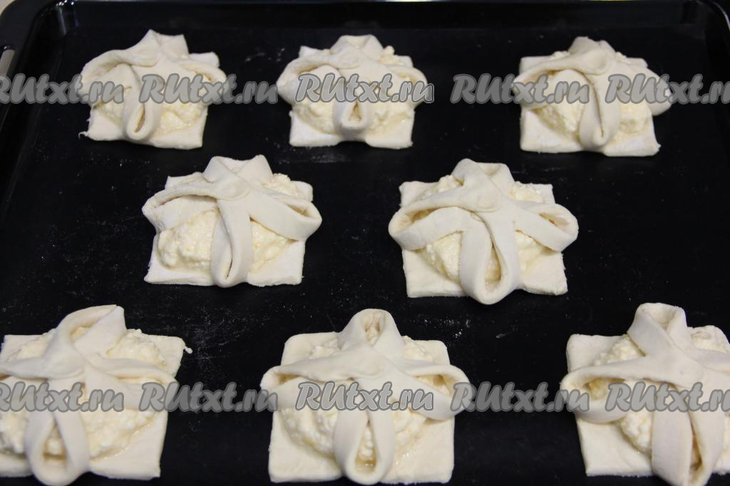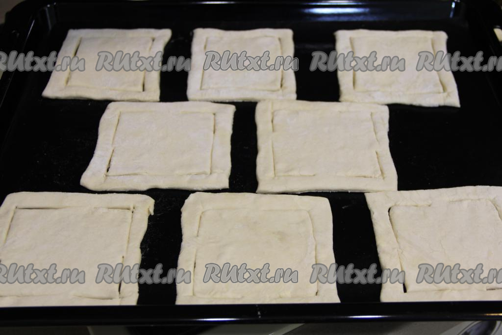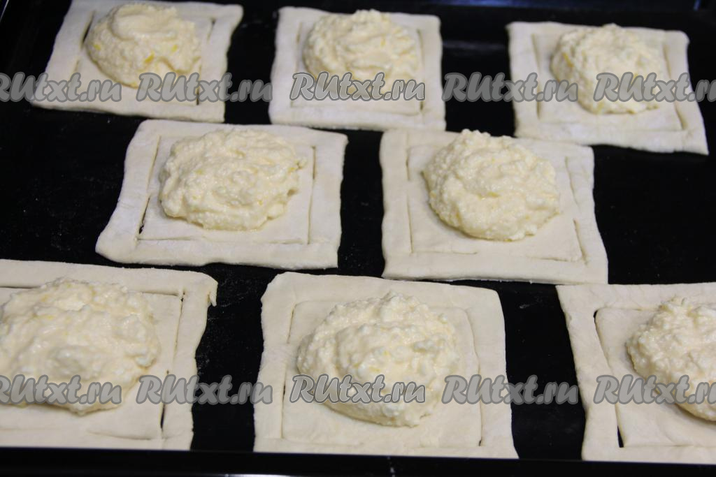 Творожно-лимонную начинку зрительно разделить на 8 частей (по количеству слоек). В центр каждого квадрата, немного отступив от разрезов, выложить часть начинки.