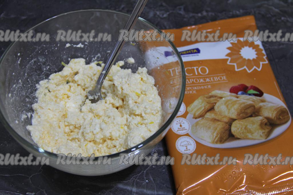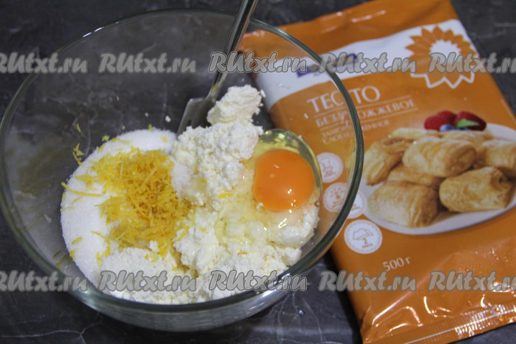 Для получения начинки для слоек нужно соединить творог, сырое яйцо, сахар, цедру и сок лимона.
