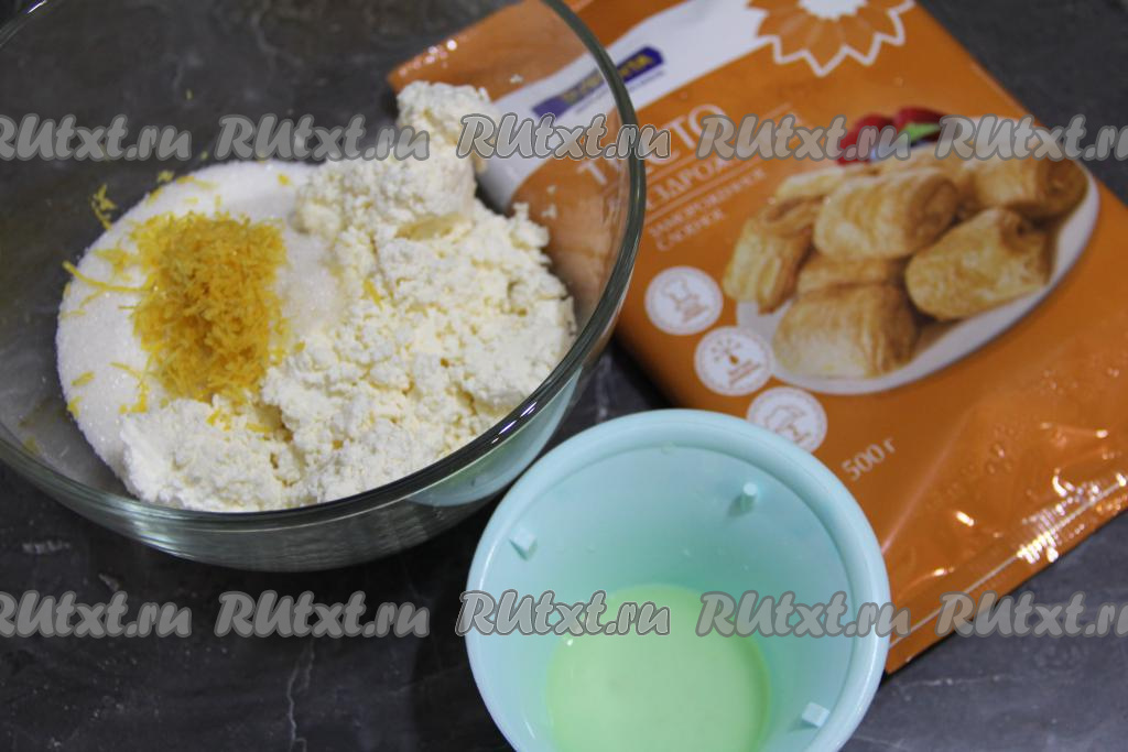 Подготовить продукты. Слоёное тесто я использовала бездрожжевое, можно взять дрожжевое - это дело вкуса. Тесто разморозить при комнатной температуре. Лимон хорошо вымыть. Снять с лимона цедру, не затрагивая находящийся под ней белый слой, нам потребуется 1 чайная ложка цедры. Выдавить из лимона сок, нам понадобится 2 чайных ложки сока.