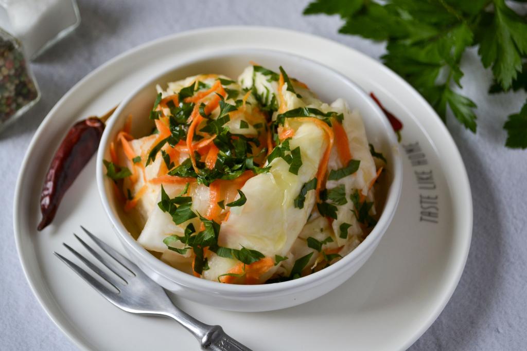 Капуста, маринованная за 12 часов, получается хрустящей, кисло-сладкой. Её можно подать к столу в качестве самостоятельной закуски или использовать для приготовления овощных салатов, первых блюд. Я подала маринованную капусту быстрого приготовления, полив подсолнечным маслом с ароматом семечек и посыпав рубленной зеленью.