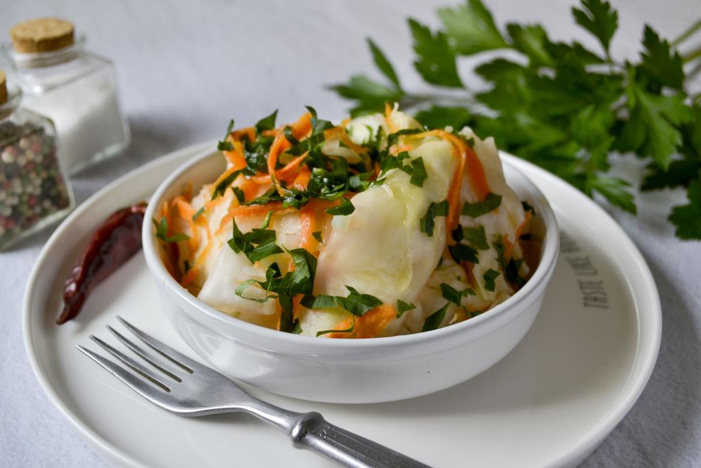Накройте капусту плоской тарелкой, на которую поставьте груз (например, банку с водой). Оставьте кастрюлю при комнатной температуре на 1-2 часа. Затем поставьте в холодильник.
