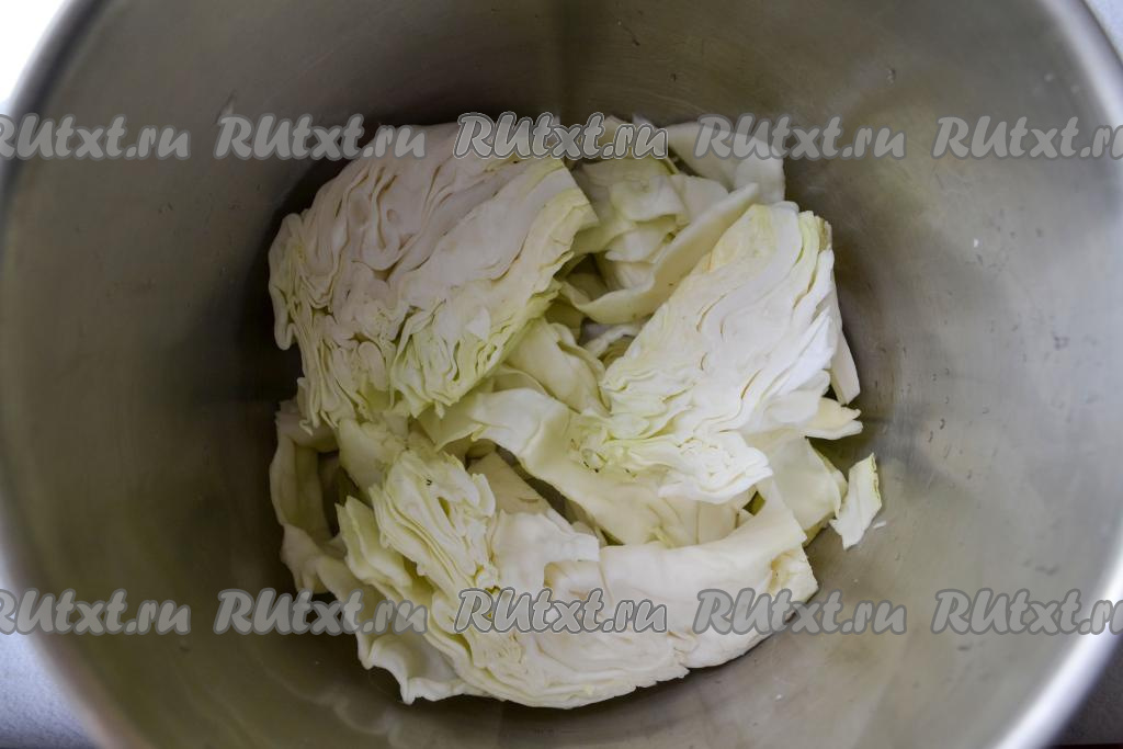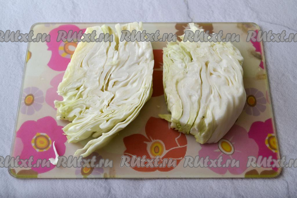 Капусту очистите от верхних жёстких листьев и нарежьте на крупные куски.