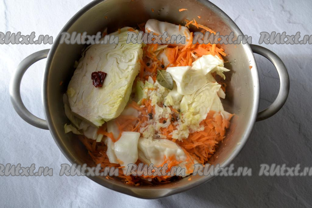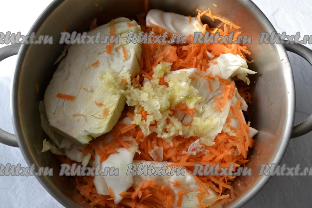 Заполните кастрюлю подготовленными овощами, чередуя слои капусты и морковки. На самый верх выложите пропущенный через пресс чеснок.