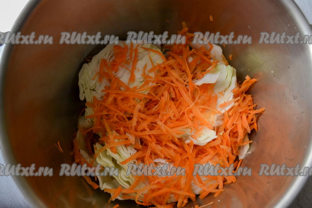 Морковь очистите и натрите на крупной тёрке. Выложите часть натёртой морковки поверх капусты.