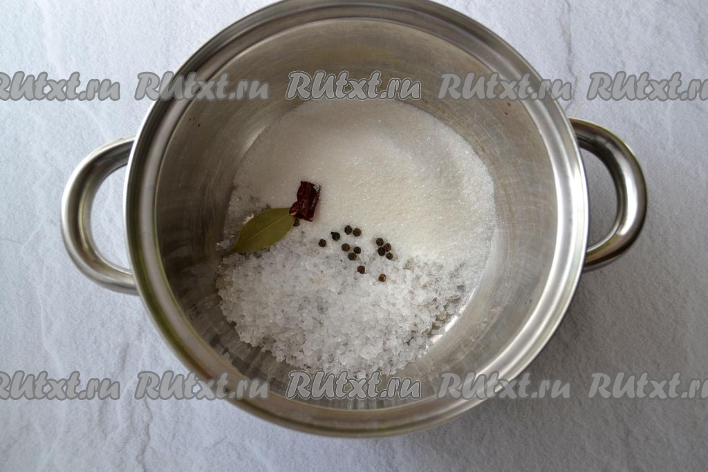 Для приготовления маринада насыпьте в небольшую кастрюльку крупную соль, сахар, горошины чёрного перца, острый красный перец, добавьте лавровый лист.