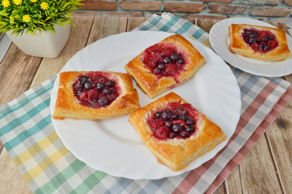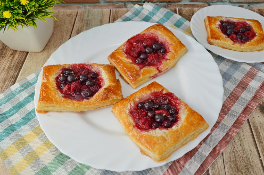Аппетитные слойки с сочной ягодной начинкой достать из духовки, дать им немного остыть и можно подавать их к чаю, кофе или с молоком. Если у вас есть замороженные ягоды, обязательно порадуйте себя и своих близких этой простой, очень вкусной и ароматной выпечкой!