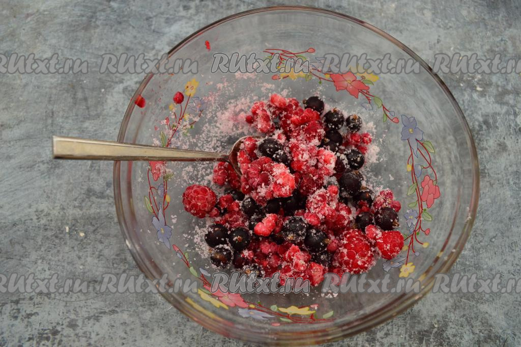 Замороженные ягоды смешать с сахаром. Я добавила 1,5 столовых ложки сахара и слойки получились в меру сладкими, но лучше количество сахара регулировать по своему вкусу, исходя из того, насколько сладкие ягоды вы взяли.