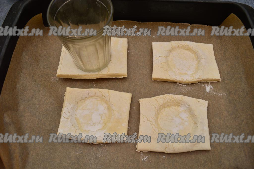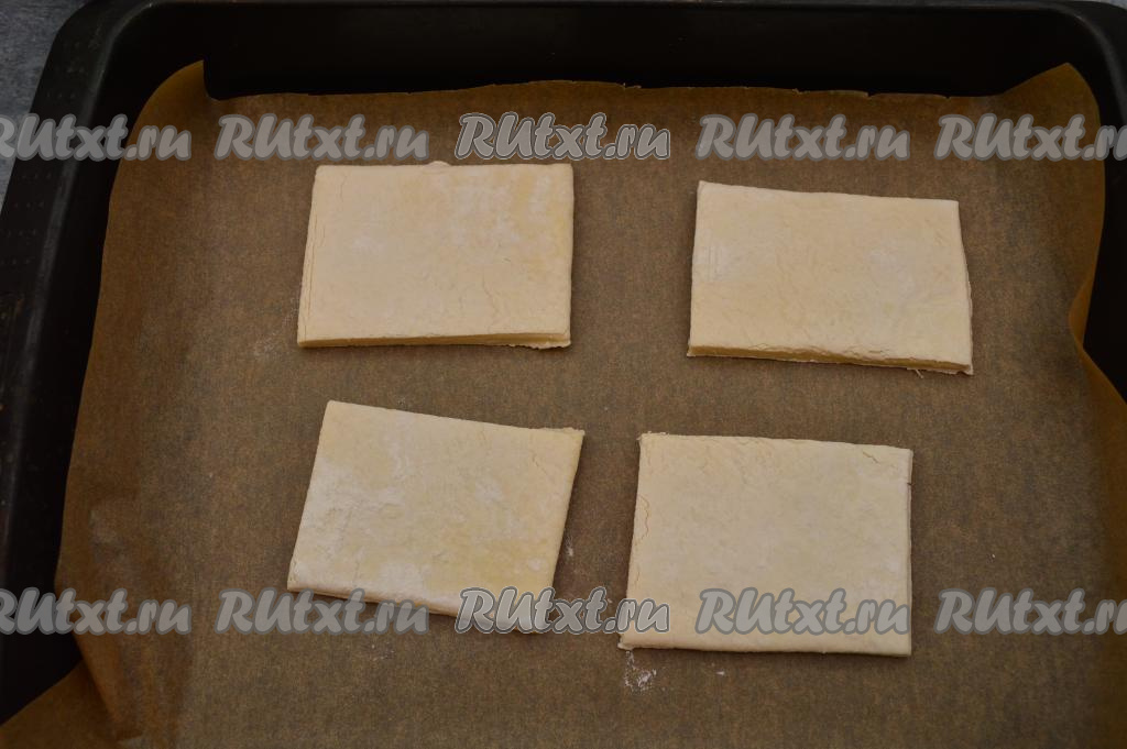 Разрезать разморозившееся слоёное тесто на 4 квадрата (раскатывать тесто не нужно). Выложить квадраты на небольшом расстоянии друг от друга на противень, застеленный пергаментной бумагой.