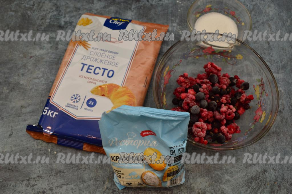 Подготовить продукты. Ягоды (у меня - замороженное ассорти из малины и чёрной смородины) можно заранее не размораживать. Дать слоёному дрожжевому, либо бездрожжевому тесту разморозиться при комнатной температуре.