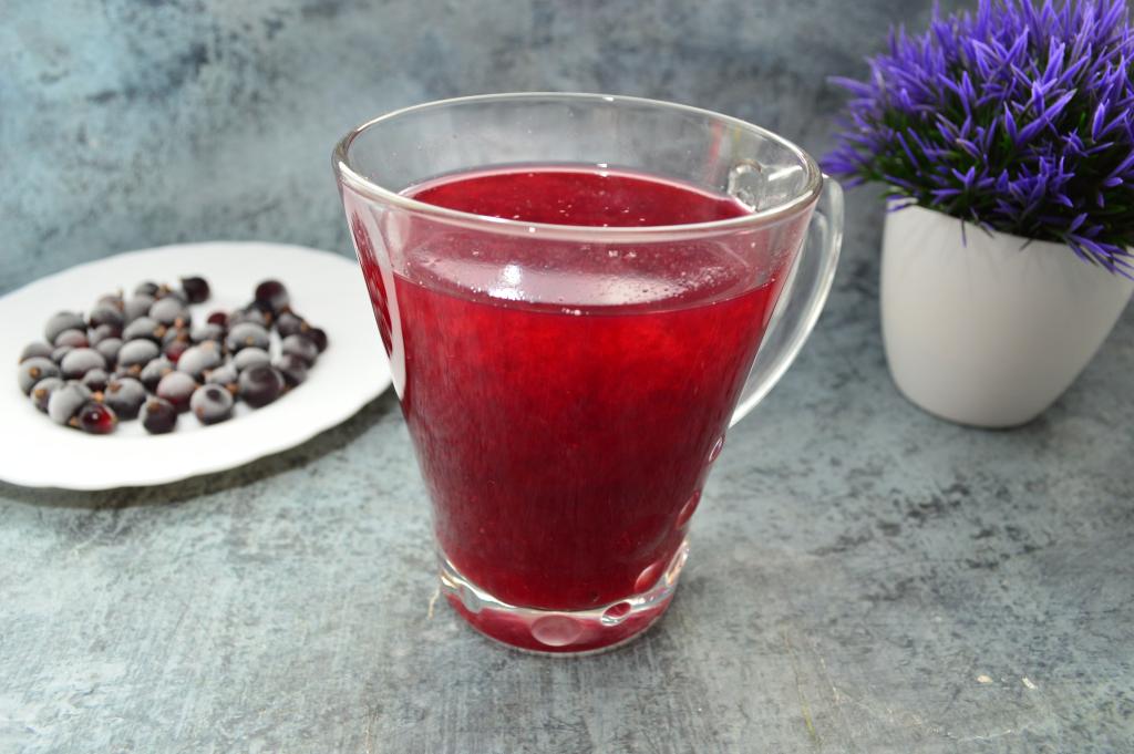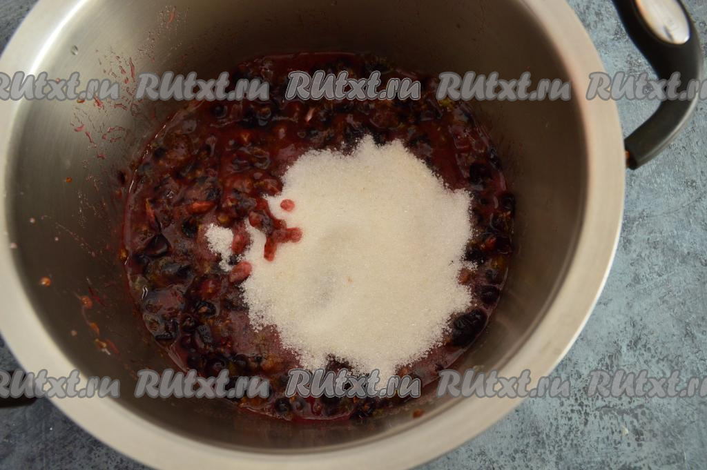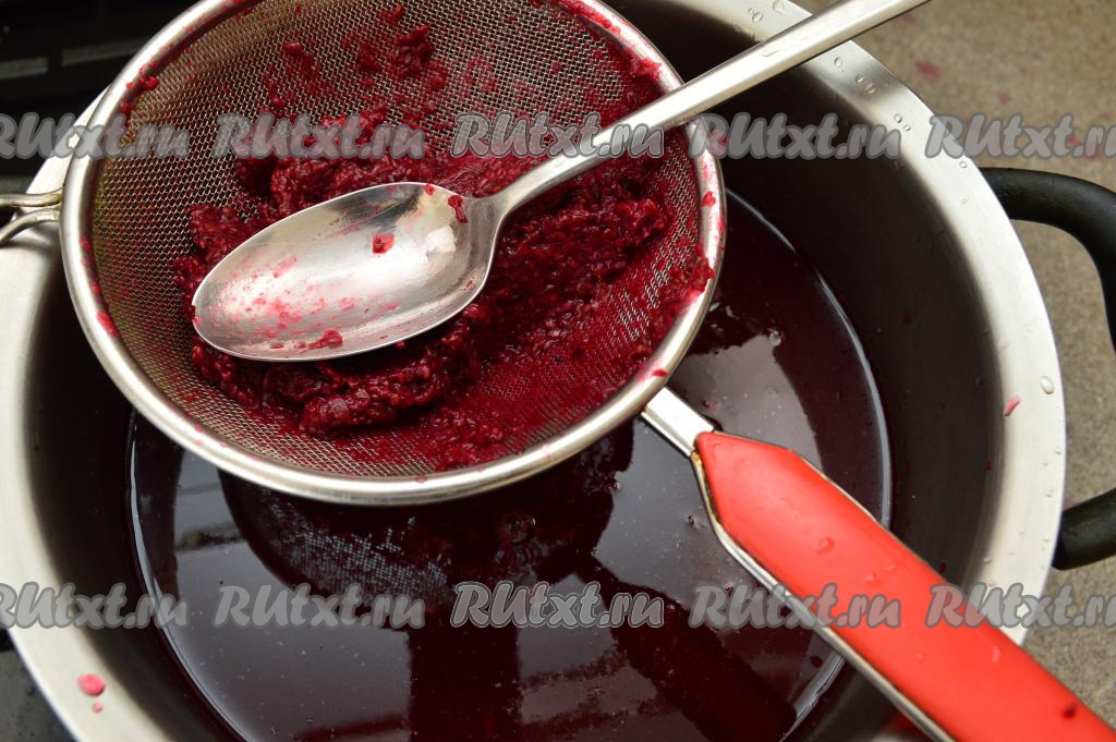Процедить слегка остывший морс из чёрной смородины через сито. Ягоды, оставшиеся в сите, перетереть через сито в кастрюлю с процеженным морсом. После перетирания ягод в сите останется совсем немного практически сухого жмыха, который можно выбросить.