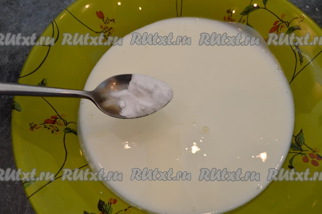 Кефир для замешивания теста для этого пирога должен быть комнатной температуры, поэтому заранее достаньте его из холодильника или подогрейте в микроволновке в течение 30 секунд. Влить кефир комнатной температуры в глубокую тарелку, всыпать соду, хорошо перемешать и оставить минут на 5.