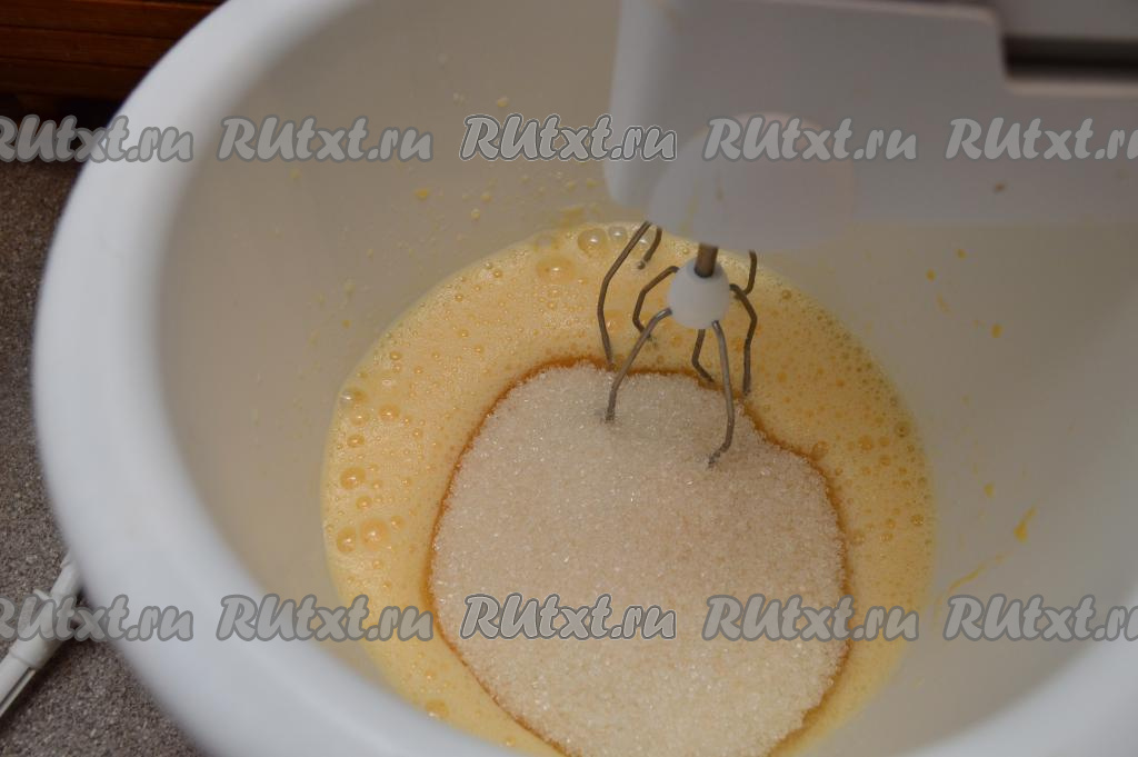 В ёмкость, удобную для взбивания миксером, вбить сырые яйца. Миксером взбить яйца в течение минуты на максимальной скорости, затем всыпать сахар. Взбивать яйца с сахаром на максимальной скорости в течение 5 минут.