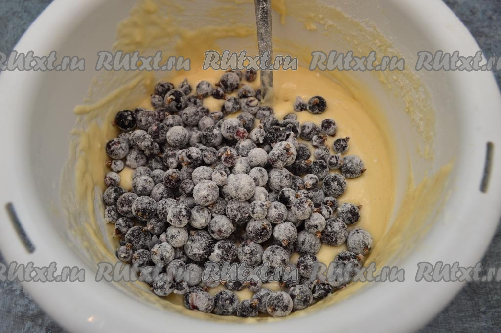 Замороженную (или свежую) чёрную смородину смешать с половиной столовой ложки муки. Ягоды обваливаются в муке для того, чтобы они не оседали на дно пирога во время выпечки.