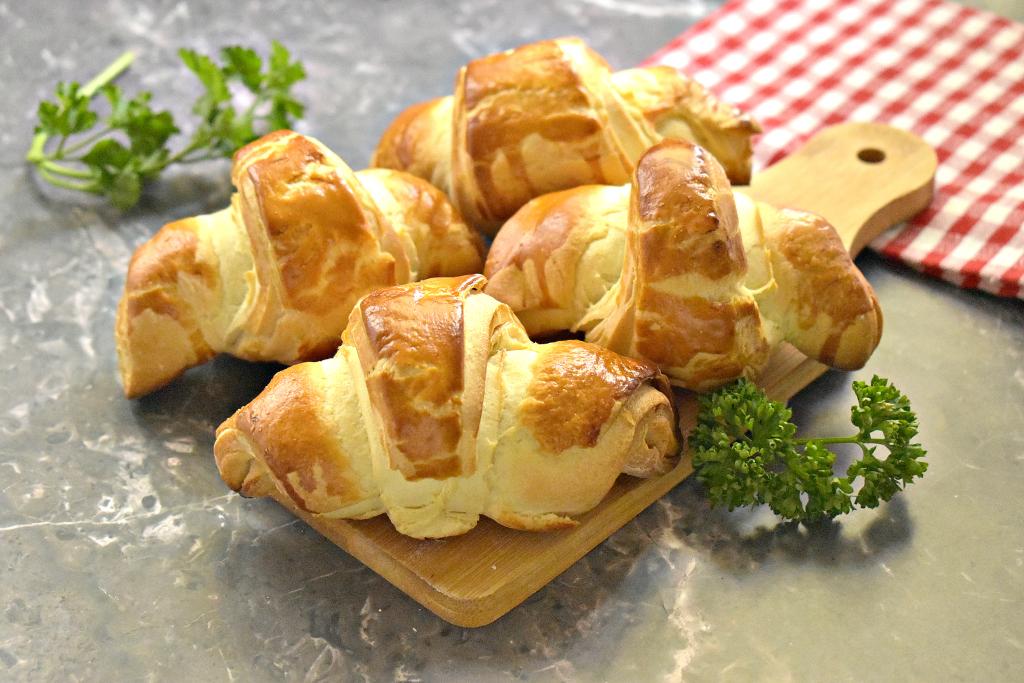 Круассаны с нежной начинкой из ветчины и сыра получились вкусными, аппетитными и сытными. Их лучше кушать в тёплом виде. Отличная выпечка из слоёного теста, попробуйте!