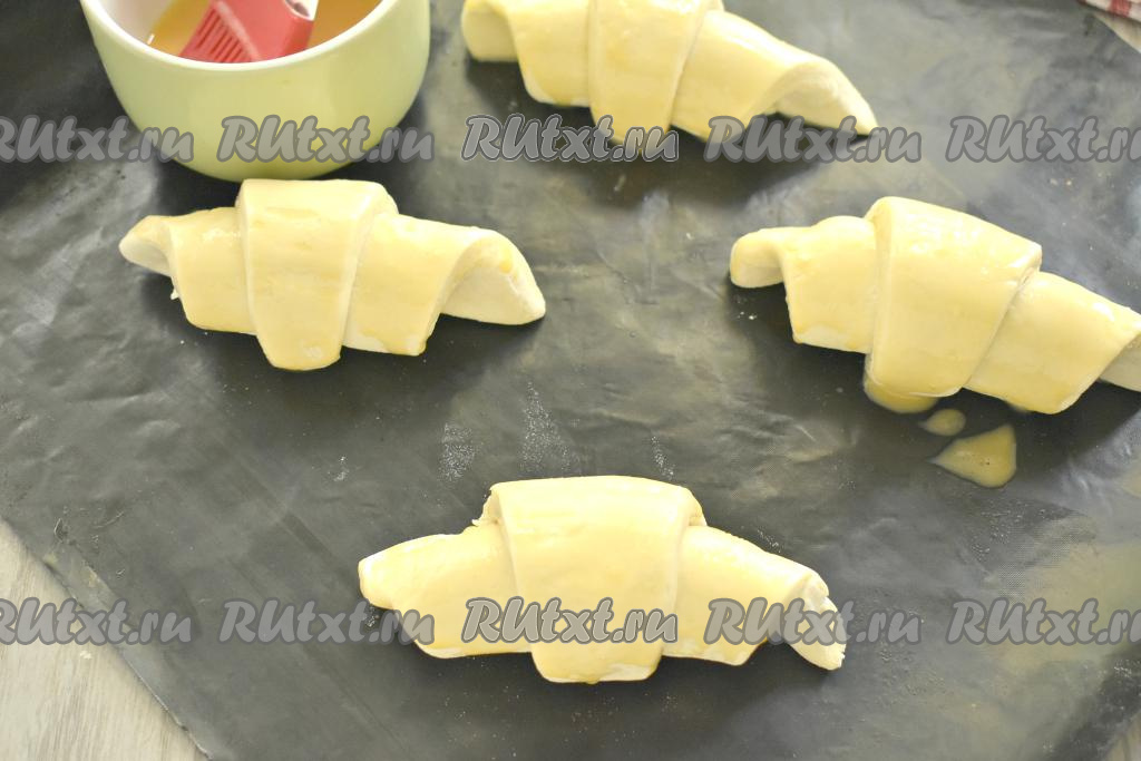 Выкладываем круассаны с ветчиной и сыром на противень, застеленный листом для выпечки (или пергаментом). Между круассанами обязательно оставляйте место, так как во время выпечки они увеличиваются в размере. Взбиваем яйцо и смазываем им круассаны.