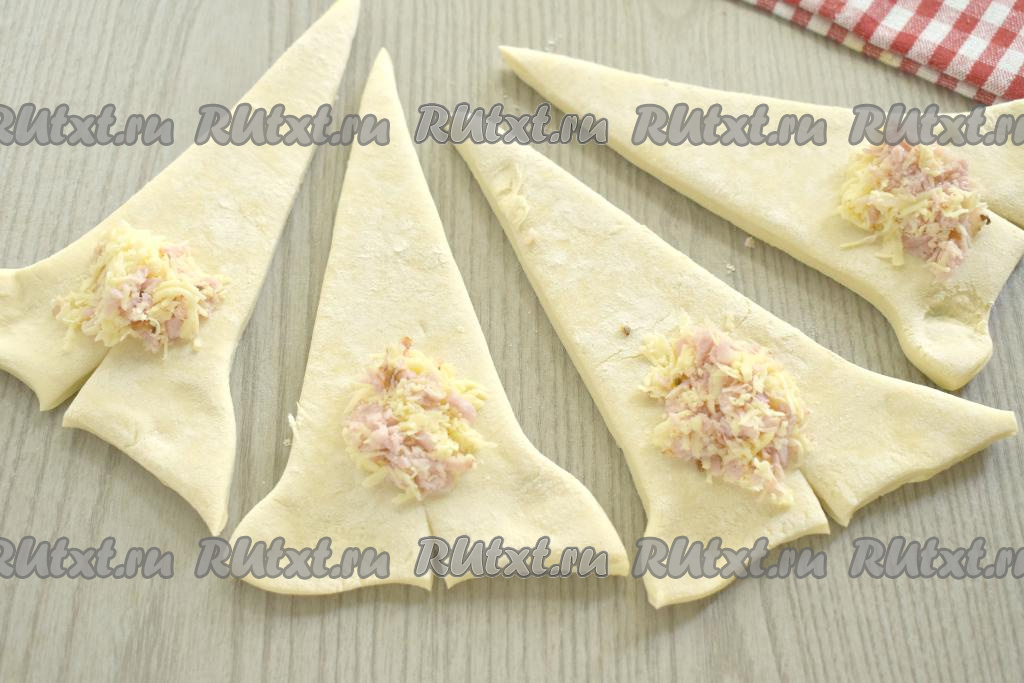 Получившуюся начинку из сыра и ветчины делим на 4 равные части. Выкладываем на треугольную заготовку возле надреза одну часть начинки.