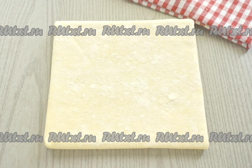 Размораживаем слоёное тесто (я взяла дрожжевое слоёное тесто) при комнатной температуре и выкладываем его на стол, слегка присыпанный мукой.