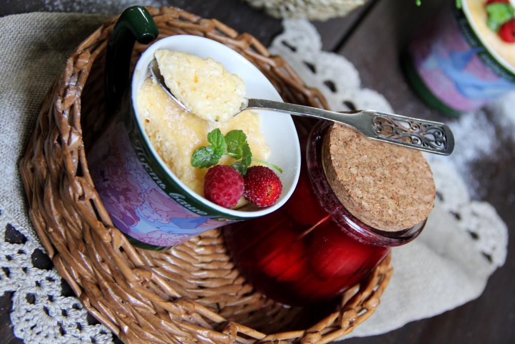 Поставить кружки в микроволновку и готовить 4-5 минут при максимальной мощности. В моей микроволновке мощность 850 Ватт. Если у вас мощность больше, то времени, возможно, потребуется немного меньше. Творожная масса должна "схватиться". Готовую творожную запеканку вынуть из микроволновки при помощи прихватки и подать к столу в кружке, дополнив сметаной, вареньем или мёдом. При подаче вкусную, воздушную запеканку можно украсить свежими ягодами.