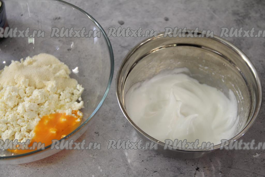 Разделить аккуратно яйцо на белок и желток. В ёмкости, удобной для взбивания, соединить яичный белок с сахаром. В другой ёмкости соединить творог с желтком и манкой.