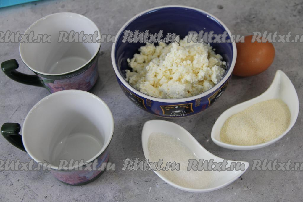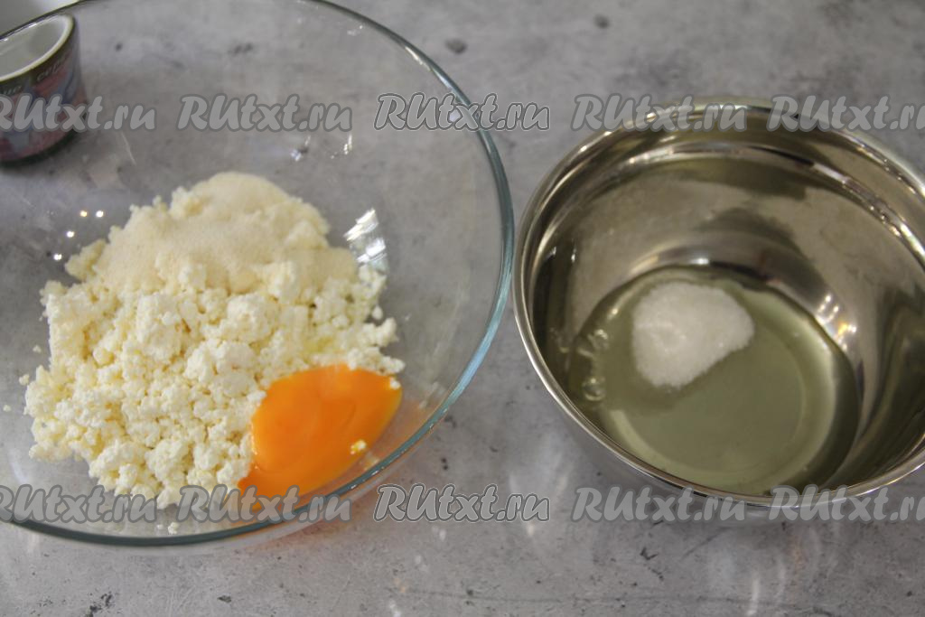 Творог с желтком и манкой перемешать миксером до однородной массы.