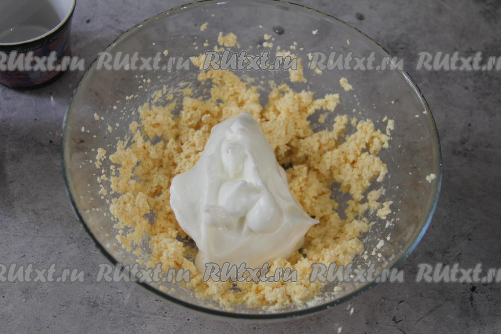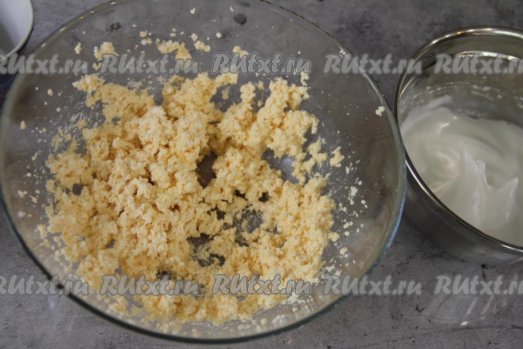 Взбитый белок переложить в миску с творожной массой.