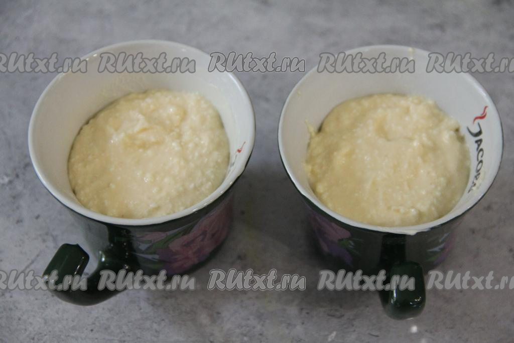Взбить массу ещё раз миксером. Кружки изнутри смазать сливочным маслом и выложить творожную массу, заполняя кружку на 2/3 объёма. Я запекала творожную запеканку в двух кружках. Не забывайте, кружки должны быть пригодны для приготовления в микроволновке, то есть без металлических и блестящих элементов.