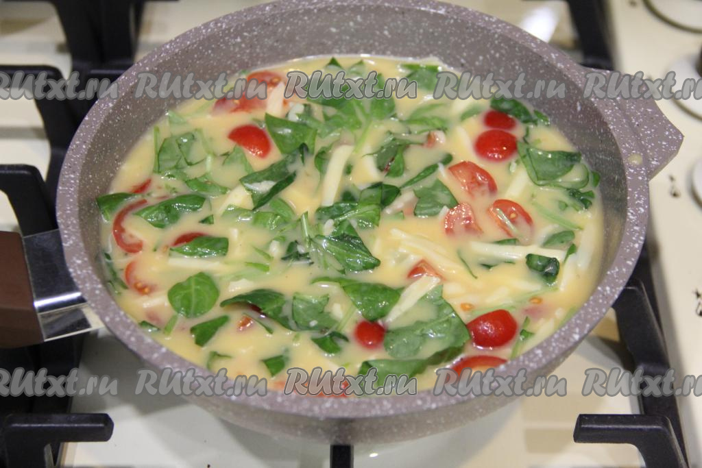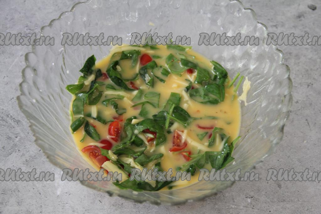 Яично-сырную массу перемешать с помидорами и шпинатом.