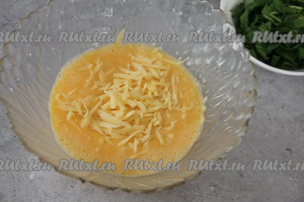 К яично-молочной смеси добавить сыр, натёртый на крупной тёрке, снова перемешать.