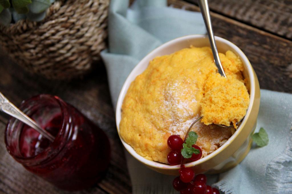 Морковный кекс хорошо поднимется. Для того чтобы проверить готовность, проколите выпечку сверху сухой зубочисткой, если зубочистка останется сухой, на ней не будет следов морковного теста, значит кекс готов, доставайте его из микроволновки. Дать выпечке слегка остыть, затем, по желанию, можно слегка её посыпать сахарной пудрой и украсить ягодами.