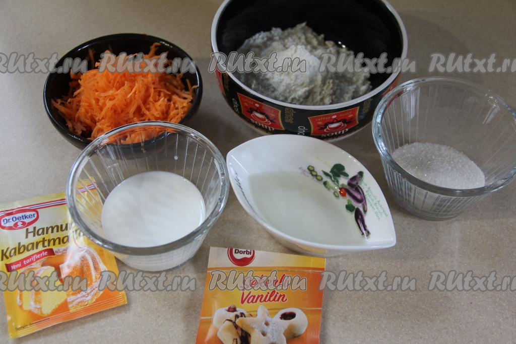 Подготовить продукты. Морковь вымыть, почистить и натереть на мелкой тёрке. Для приготовления кекса потребуется 3 столовых ложки натёртой моркови. Все продукты отмеряла обычной столовой ложкой. Муку, морковь и сахар отмерила без горки.