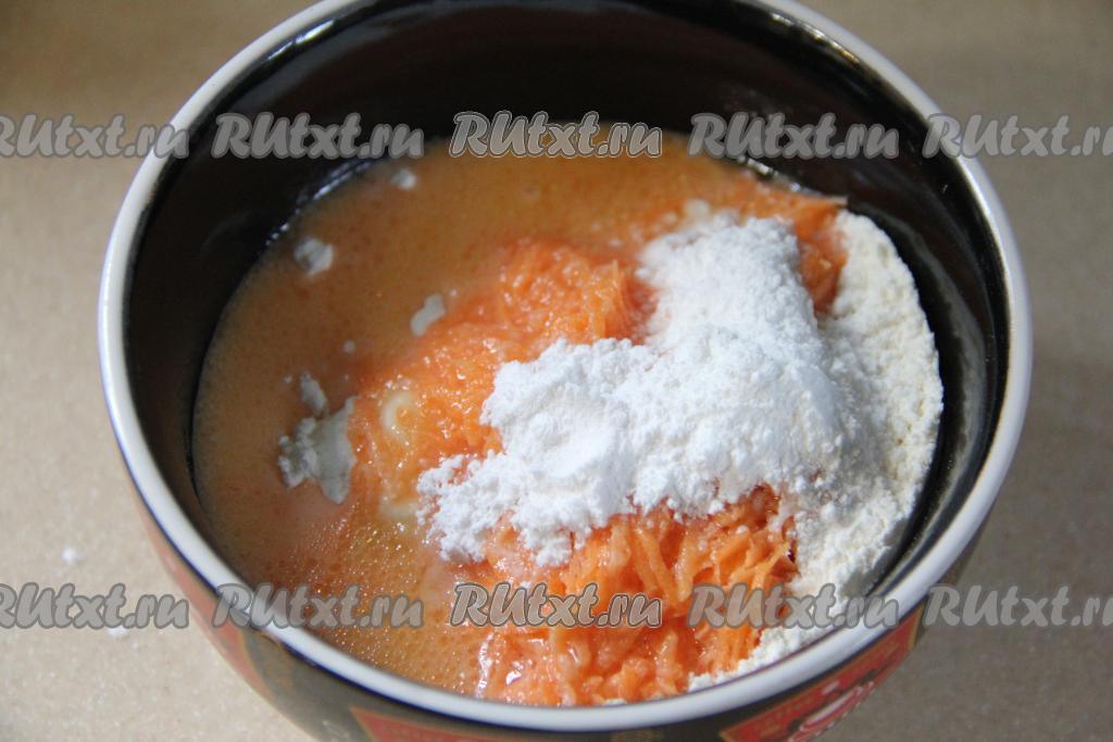 Добавить натёртую морковь, муку, разрыхлитель, сахар, корицу и ванилин.