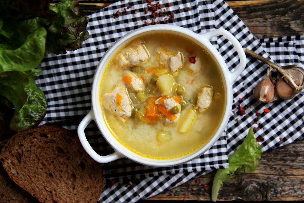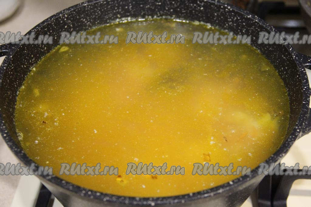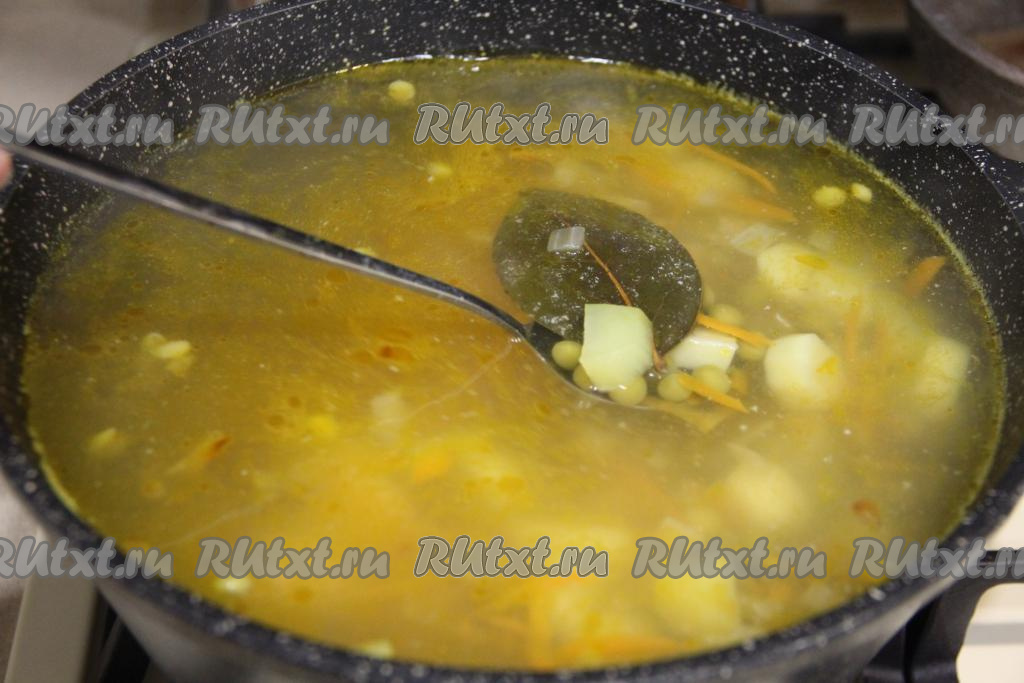 Если же вы готовите со свежим зелёным горошком или консервированным, тогда после того как суп проварится с обжаренными овощами 5 минут, в него нужно выложить консервированный горошек без жидкости или свежий горошек, очищенный от стручков. Довести суп до кипения.