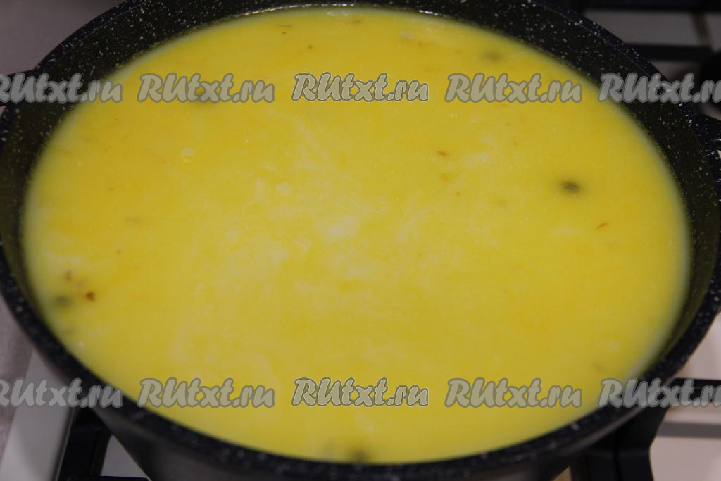 В кипящий суп с зелёным горошком выложить плавленный сыр, посолить по вкусу, добавить любые специи, тщательно перемешать сырный суп.