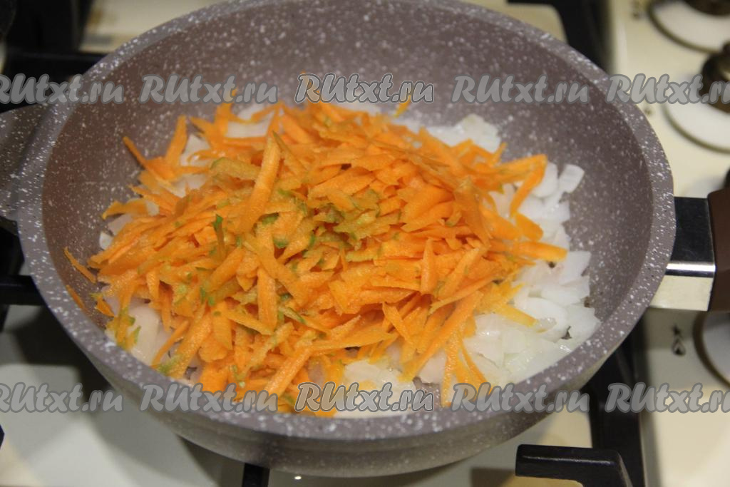 К обжаренному луку выложить морковку, натёртую на крупной тёрке, сразу перемешать и обжаривать, иногда помешивая, минут 5 (до мягкости моркови), убрать с огня.