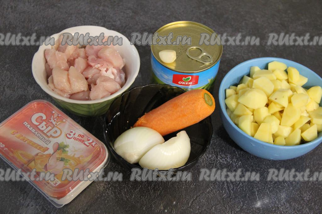 Подготовить продукты. Картошку, лук, чеснок и морковку почистить. Картошку нарезать на средние кубики, залить водой, чтобы картошка не почернела. Куриное филе нарезать на средние кусочки. Я варила суп с консервированным горошком. Но отличным будет суп и со свежим или замороженным зелёным горошком.