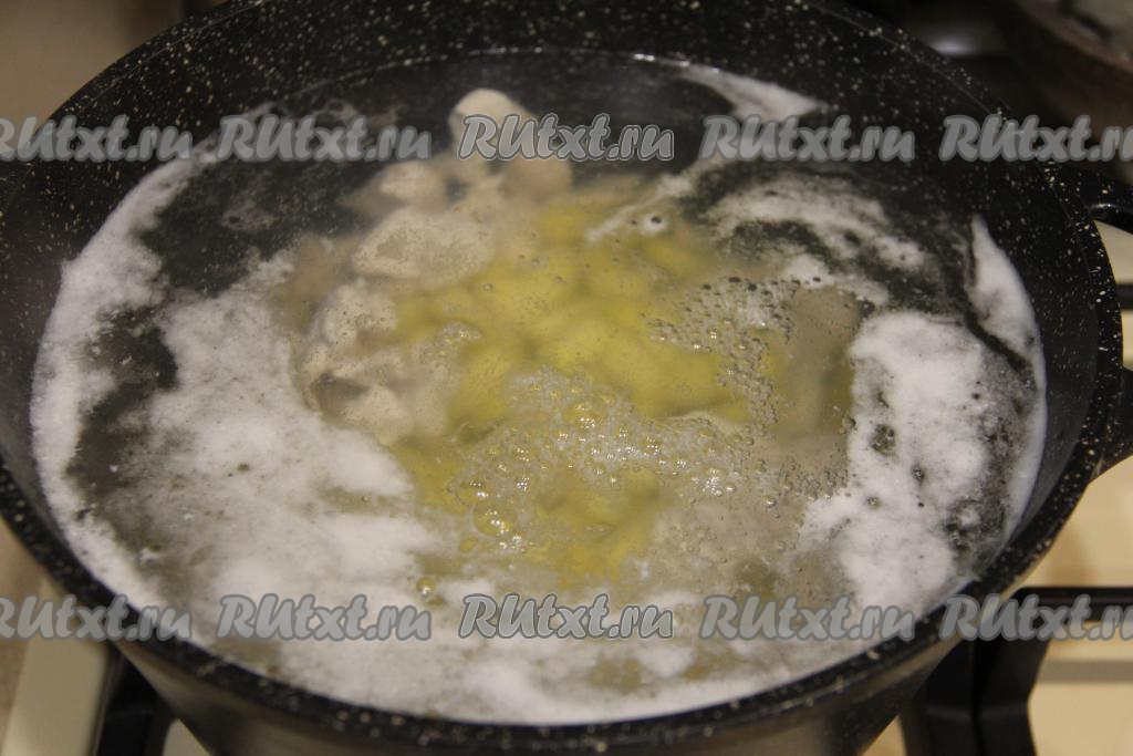 Затем добавить нарезанную картошку, снова дать закипеть и варить на небольшом огне 10 минут.