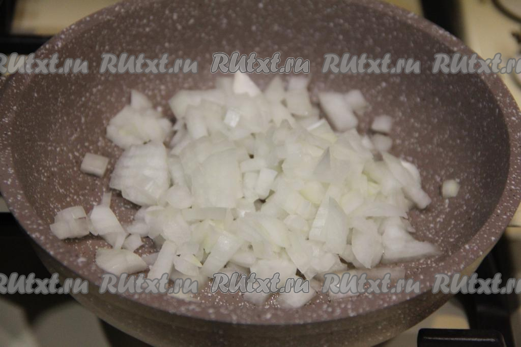 Влить растительное масло в сковороду, прогреть, уменьшить огонь до среднего, выложить мелко нарезанную луковицу и обжаривать 4-5 минут (до мягкости лука), иногда помешивая.