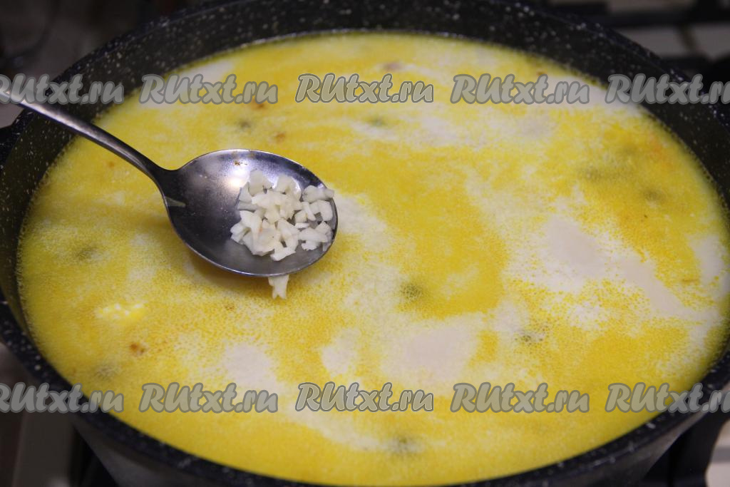Довести до кипения, как только сыр расплавится, выложить в суп мелко нарезанный чеснок, ещё раз довести до кипения. Накрыть кастрюлю крышкой и снять с огня, дать настояться 5-10 минут.