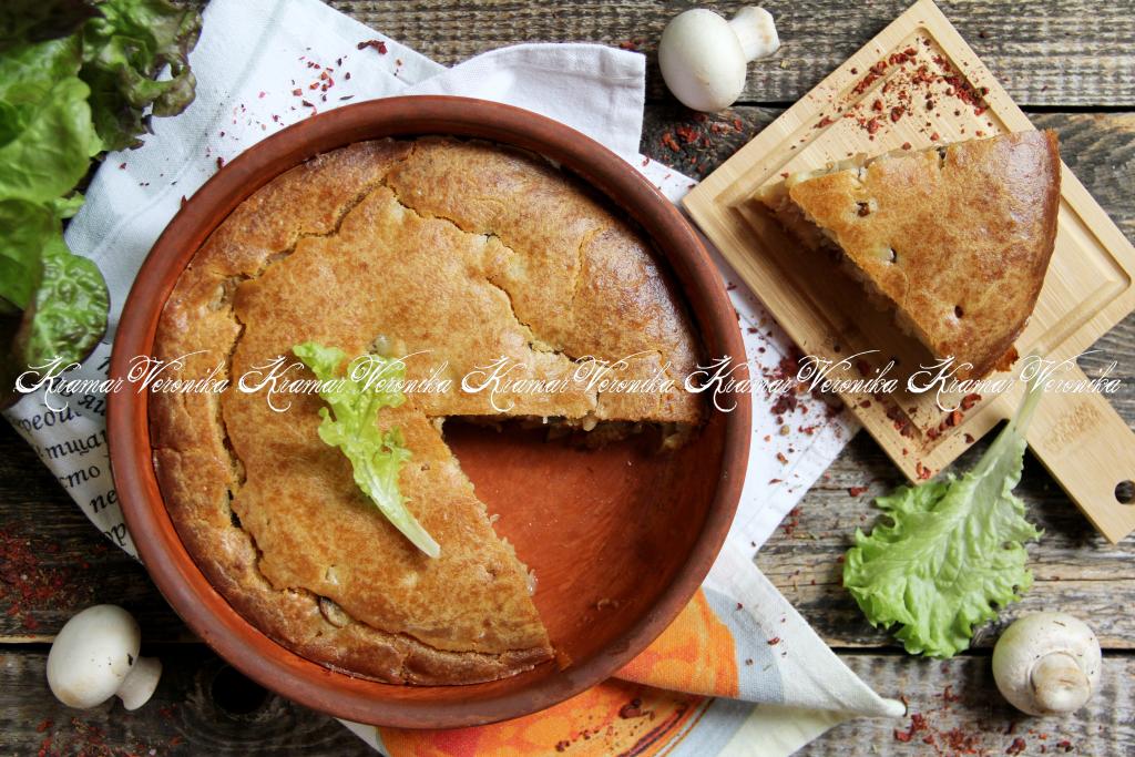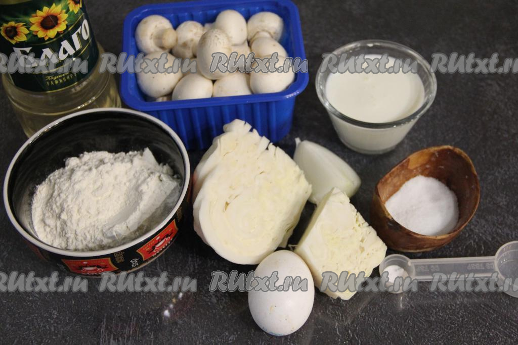 Подготовить продукты. Лук очистить. Капусту вымыть, убирая порченые листы, если они есть. Шампиньоны промыть водой, дать им немного обсохнуть. Если будете готовить с лесными грибами, их нужно будет отварить в течение 25-30 минут с момента закипания воды, затем лишнюю воду слить. Кефир можно взять любой жирности.