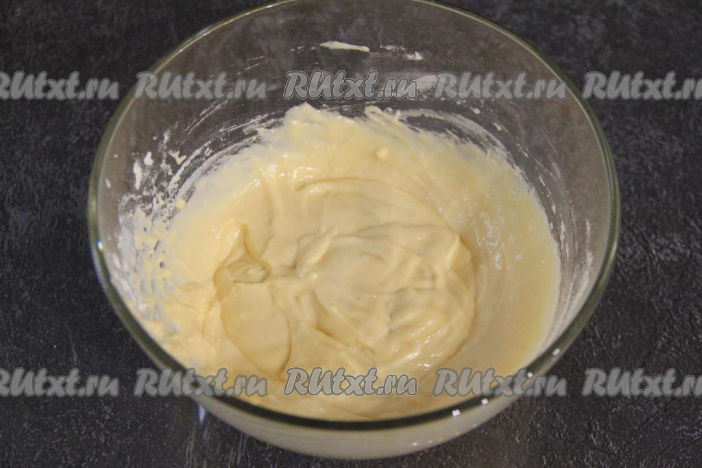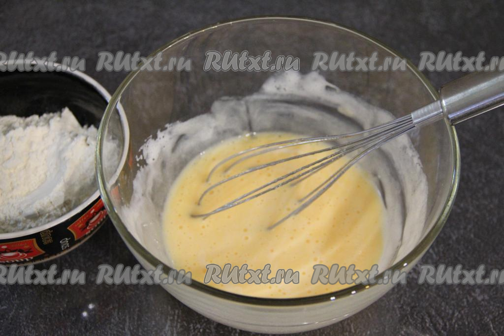 Частями начать всыпать муку, каждый раз перемешивая тесто венчиком до однородности.