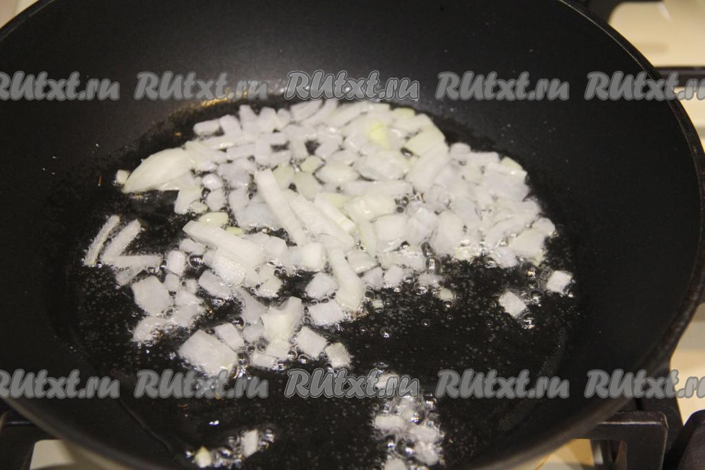 Вначале приготовим начинку для пирога. Для этого в сковороду с разогревшимся растительным маслом нужно выложить мелко нарезанный лук и обжарить его в течение 3-4 минут, иногда помешивая, на среднем огне.