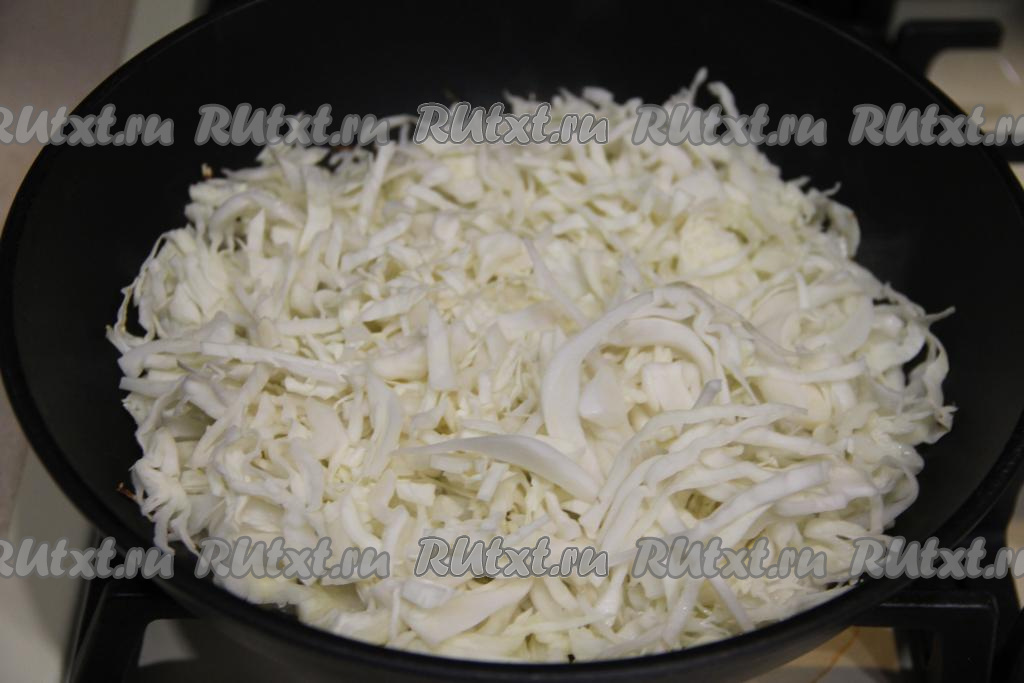 Затем выложить тонко нарезанную капусту, перемешать, обжаривать овощи 5-7 минут, периодически перемешивая.