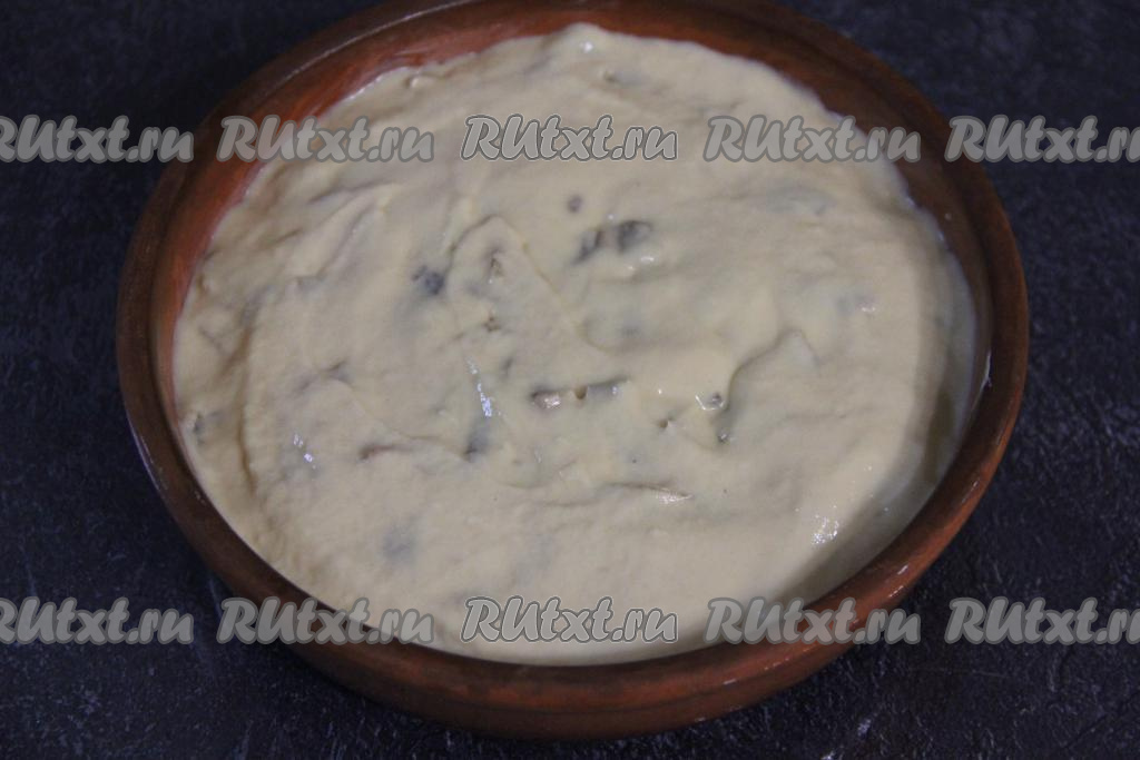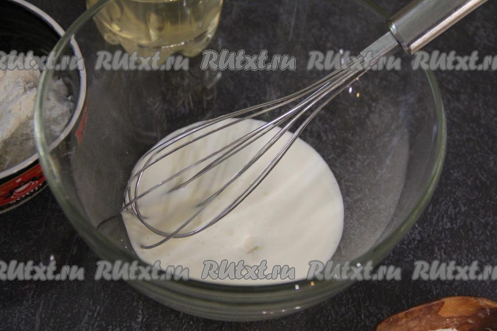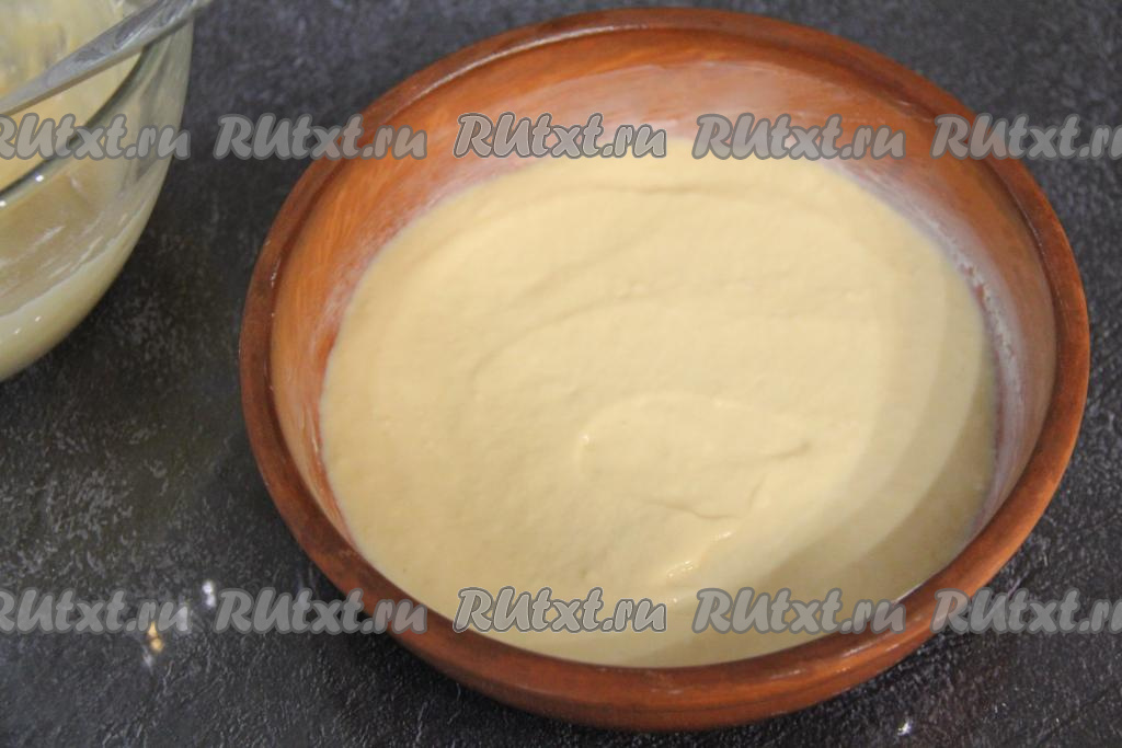Добавляя понемногу муку и хорошо вмешивая её венчиком, замесить однородное, в меру густое тесто, напоминающее сметану средней жирности.