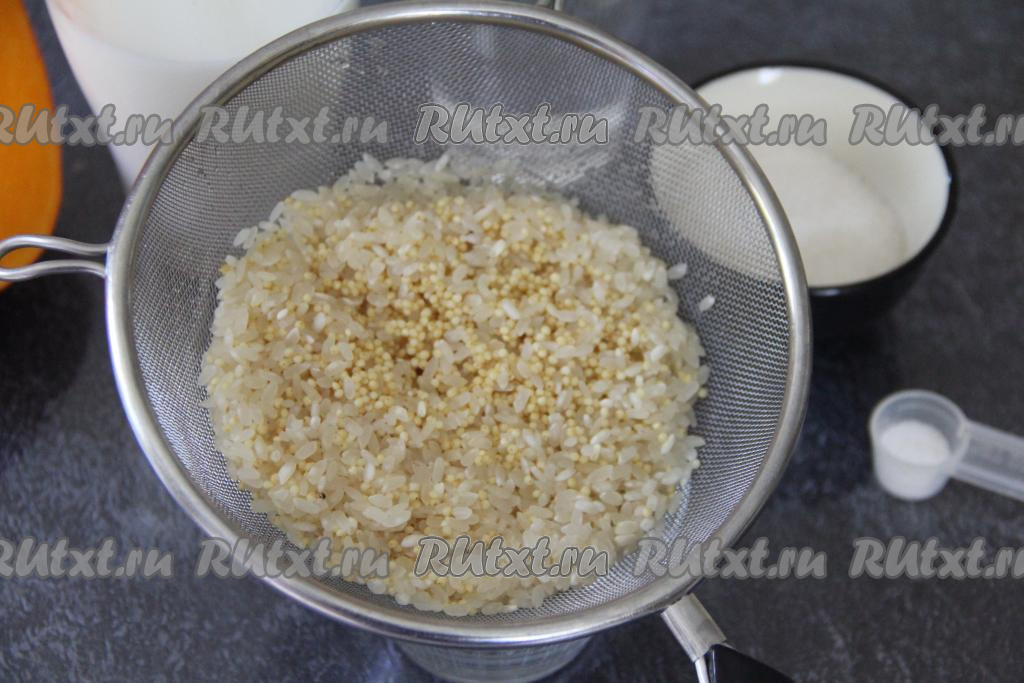 Отмерить пшено и рис, всыпать крупы в сито и хорошо промыть под проточной водой.
