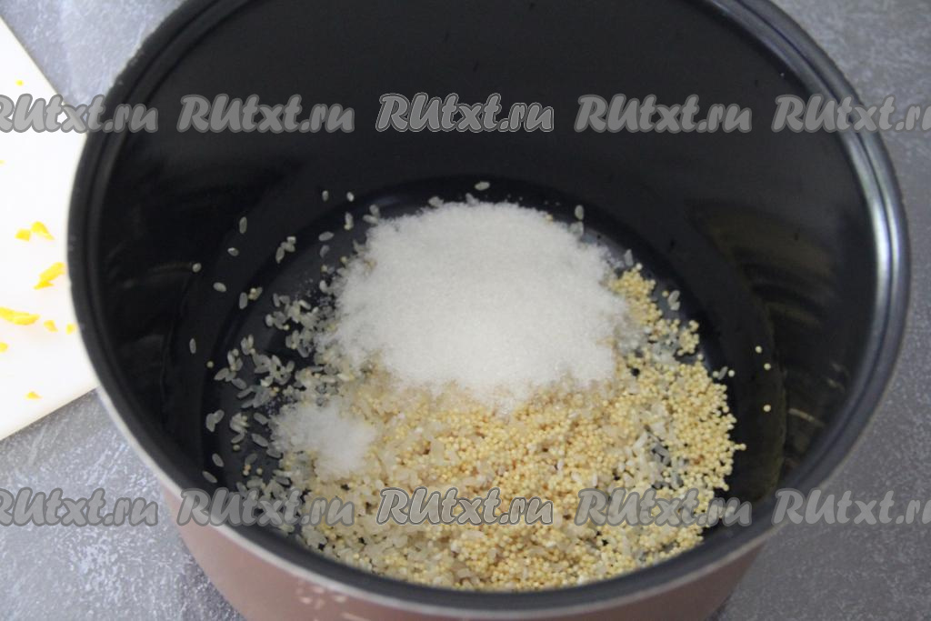 В чашу мультиварки выложить промытый рис с пшеном, всыпать соль и сахар.