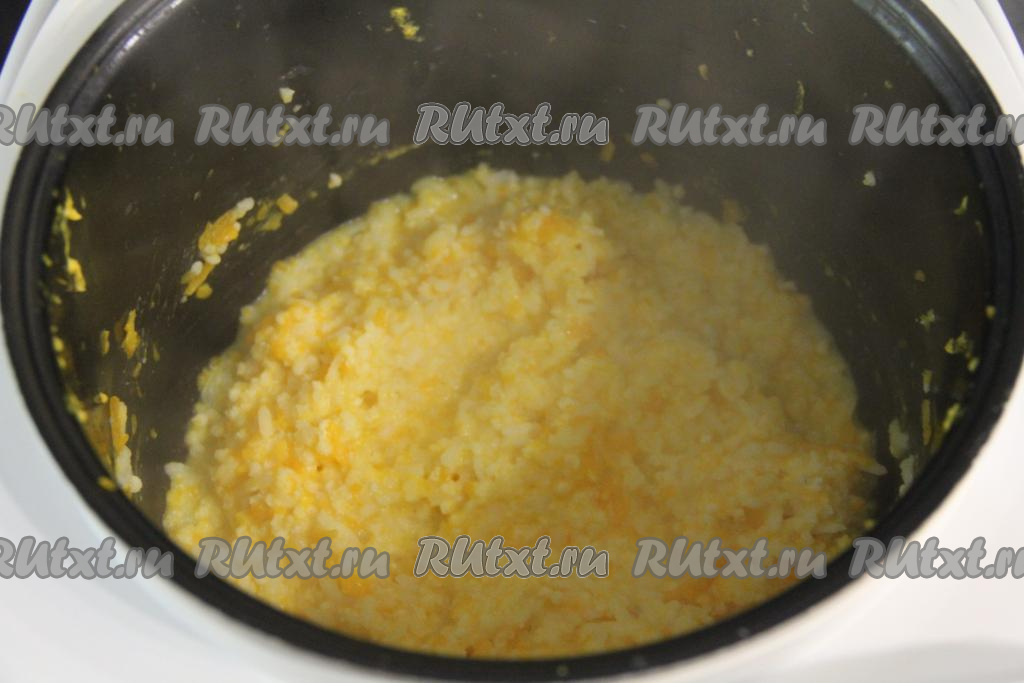 В чашу мультиварки добавить натёртую тыкву, влить молоко и воду, перемешать и поставить чашу в мультиварку. Закрыть крышку и выставить режим "Каша" или "Молочная каша" на 25 минут.