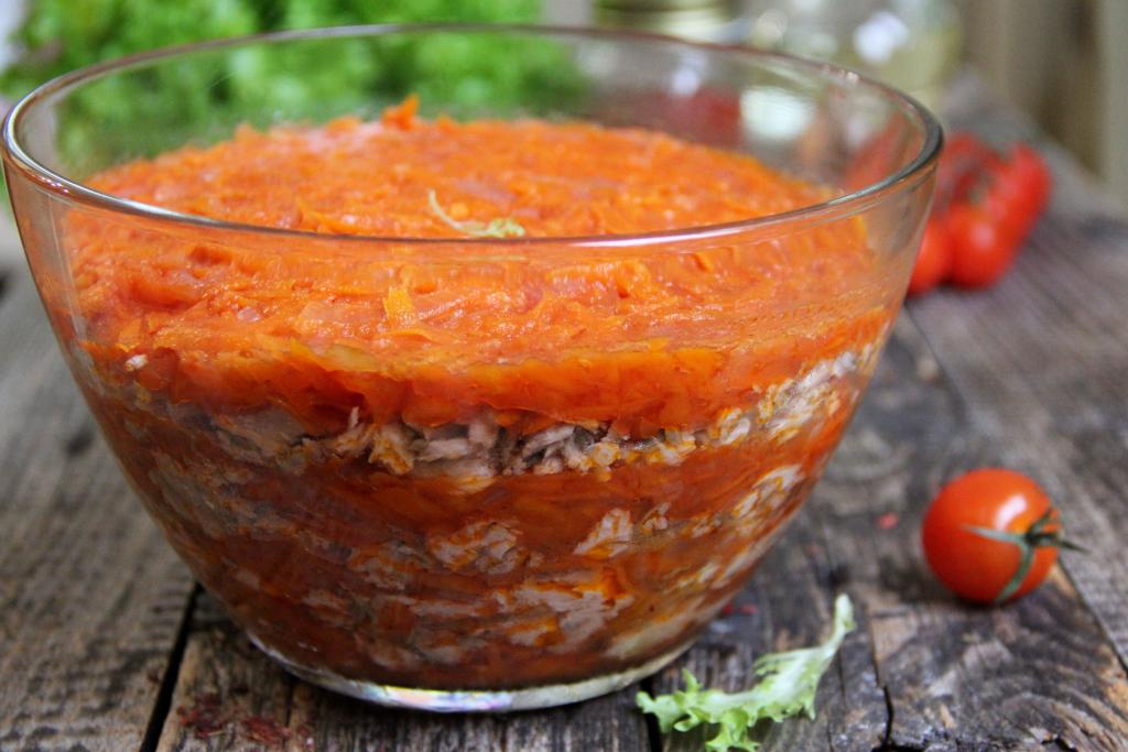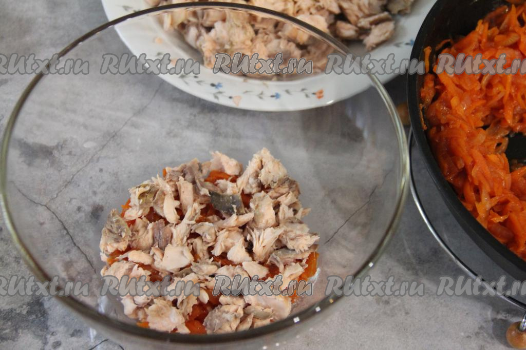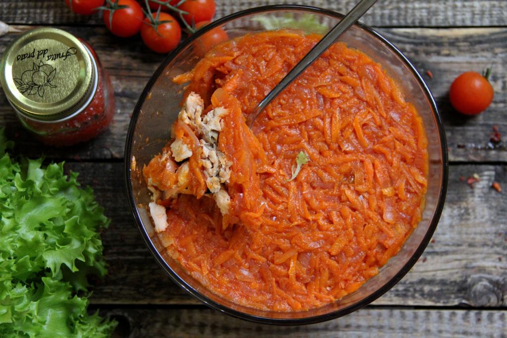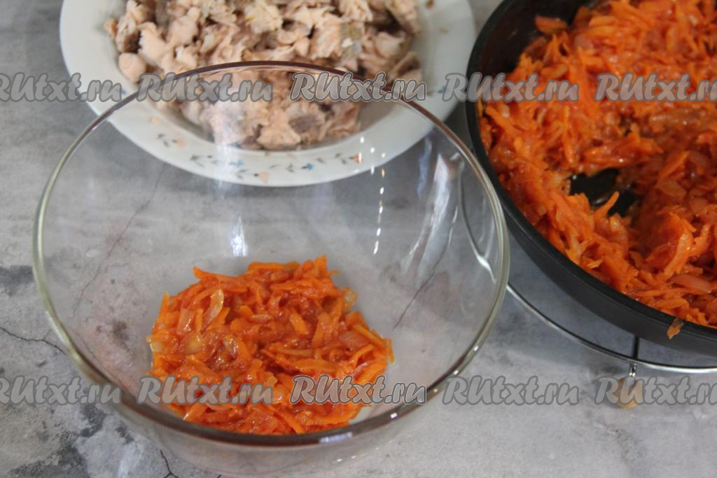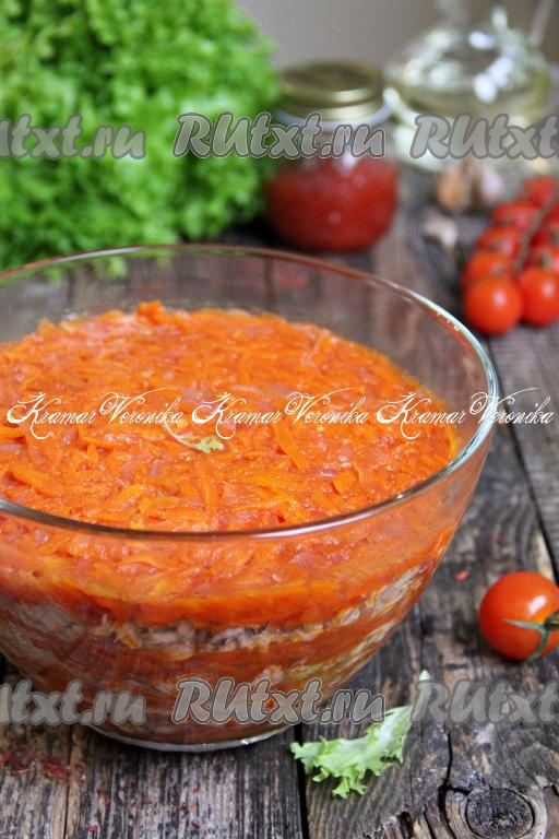 Таким образом, чередуя, продолжить выкладывать в салатник слоями маринад из моркови с луком и варёную горбушу, пока не закончатся овощи и рыба. Верхним слоем должен быть маринад. Поместить салатник в холодильник для пропитки на ночь (или, как минимум, на 10 часов).